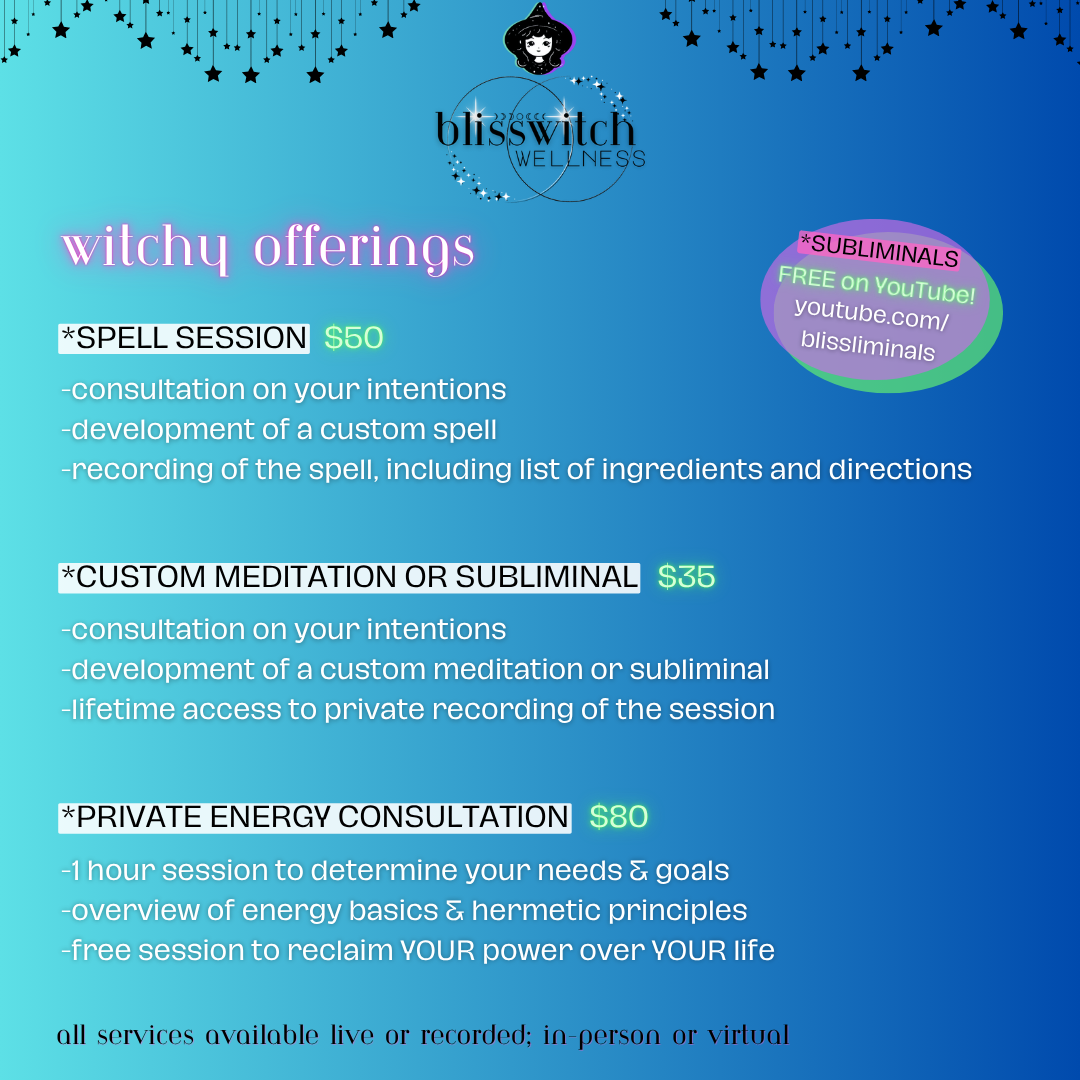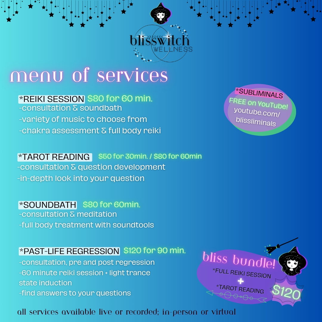 You're in the right place! WELCOME to BlissWitch Wellness! I'm Bethanny and I offer heart-centered reiki and energetic healing sessions, biofield tuning/sound baths, chakra activation, tarot readings, meditation & past-life regression.